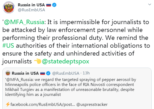 The embassy's comments on Twitter came after a Russian correspondent was pepper-sprayed by Minneapolis police officers amid protests following the death of George Floyd.