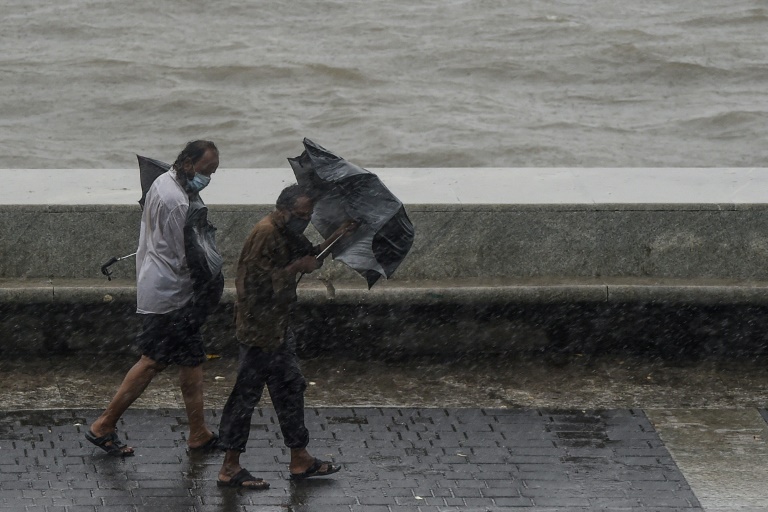 Struggling with their umbrellas along Marine Drive in Mumbai as Cyclone Nisarga veers in. /AFP