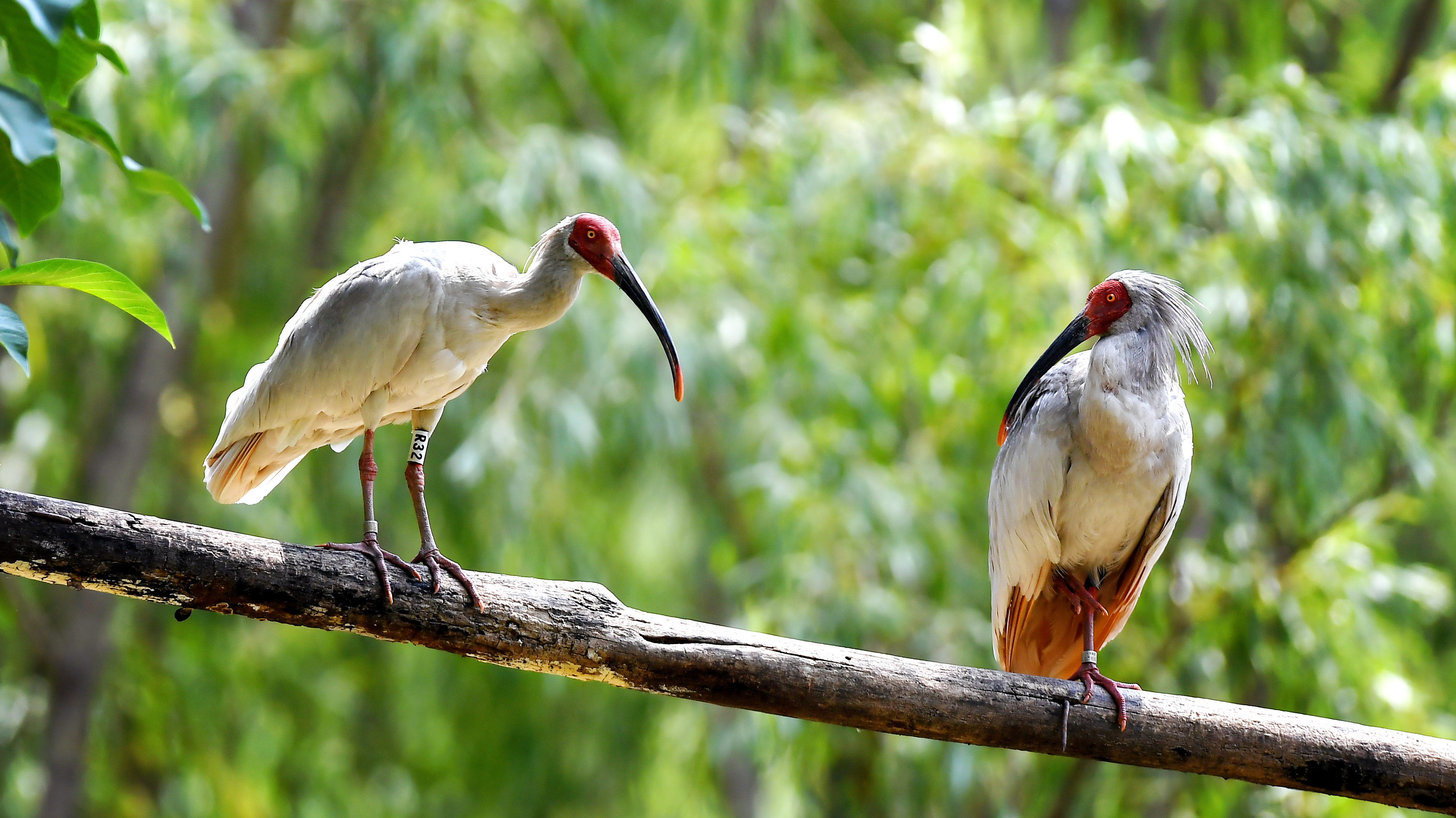 Crested ibis rest at a wild training base in Tongchuan City, northwest China's Shaanxi Province, June 13, 2019. /Xinhua