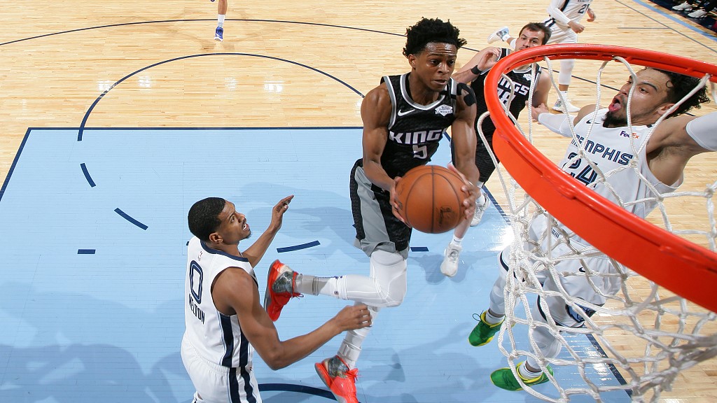 De'Aaron Fox #5 of the Sacramento Kings drives towards the rim in the game against the Memphis Grizzlies at the FedExForum in Memphis, Tennessee, February 28, 2020. /VCG