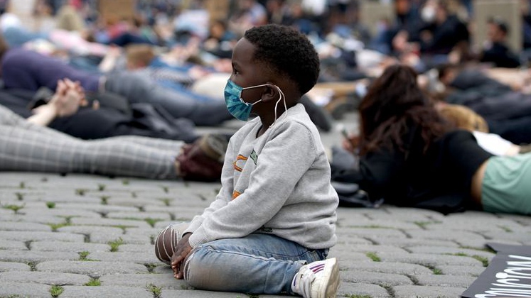 A boy sits during a protest over the death of George Floyd in Prague, Czech Republic, on June 6, 2020. /Xinhua