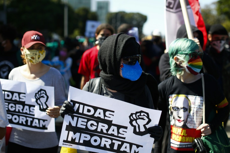 Protesters against President Jair Bolsonaro in Brasilia hold placards denouncing "fascism" and supporting the Black Lives Matter movement. /AFP