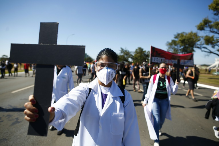 Demonstrators in Brasilia demand democracy and an end to racism and fascism. /AFP