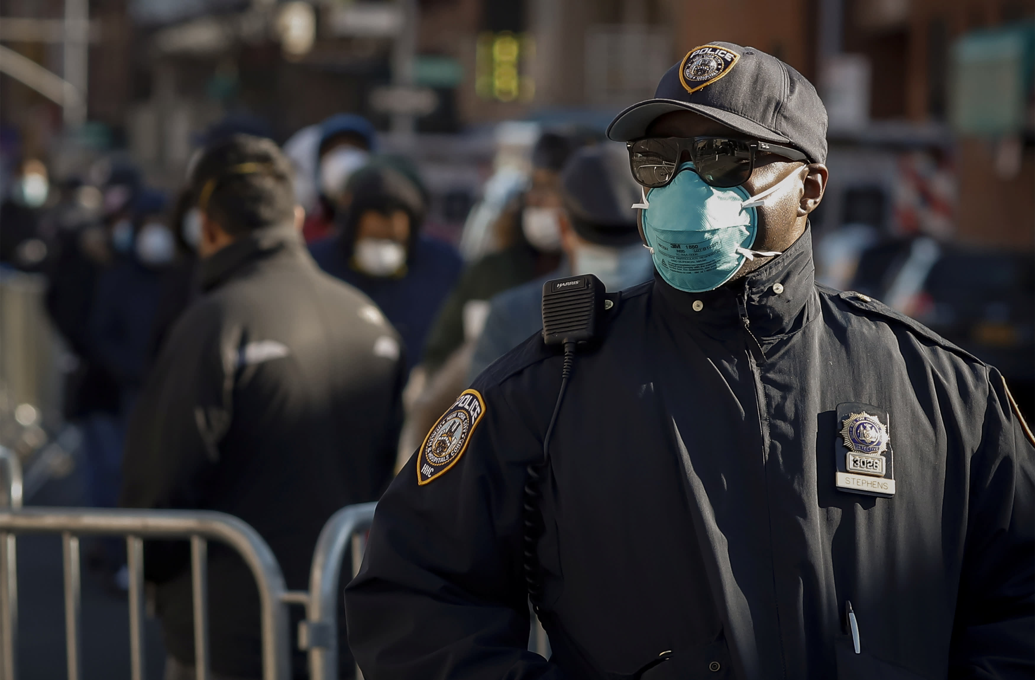 A New York City Police officer wears protective gear, while monitoring people waiting in line to be tested for coronavirus disease (COVID-19) outside Elmhurst Hospital Center in the Queens borough of New York City, U.S.. /Reuters