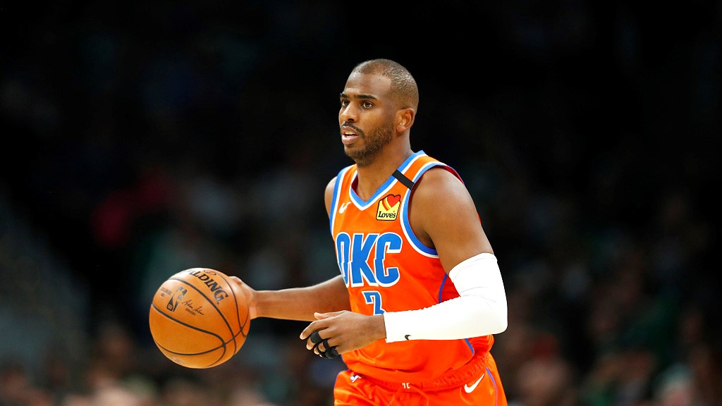 Chris Paul of the Oklahoma City Thunder, also president of the National Basketball Players Association (NBPA), handles the ball in the game against the Boston Celtics at the TD Garden in Boston, Massachusetts, March 8, 2020. /VCG