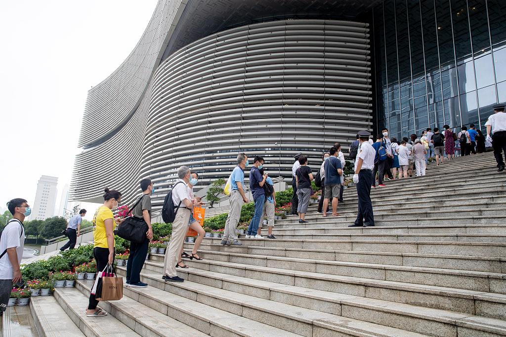 People queue up outside Hubei Provincial Library in Wuhan City, Hubei Province on Sunday, June 14, 2020. /CFP