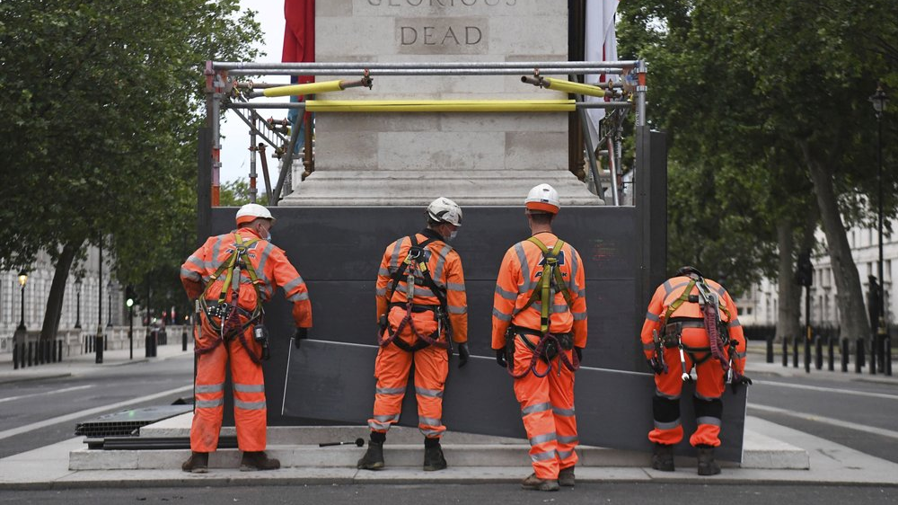 Scaffolders erect boarding around the Cenotaph on Whitehall in London, Thursday, June 11, 2020, following Black Lives Matter protests that took place across the UK over the weekend. The protests were ignited by the death of George Floyd, a black man, who died after he was restrained in Minneapolis police custody on May 25 in the U.S. /AP