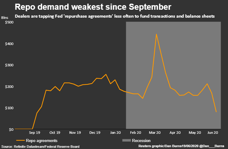 The waning demand has come as markets more widely have regained their footing after March's big swoon. Stocks have recovered around 90 U.S. dollars of their losses, companies are raising capital in the bond market at a record pace, and risk premiums embedded in corporate bonds yields are back to where they were in early March.