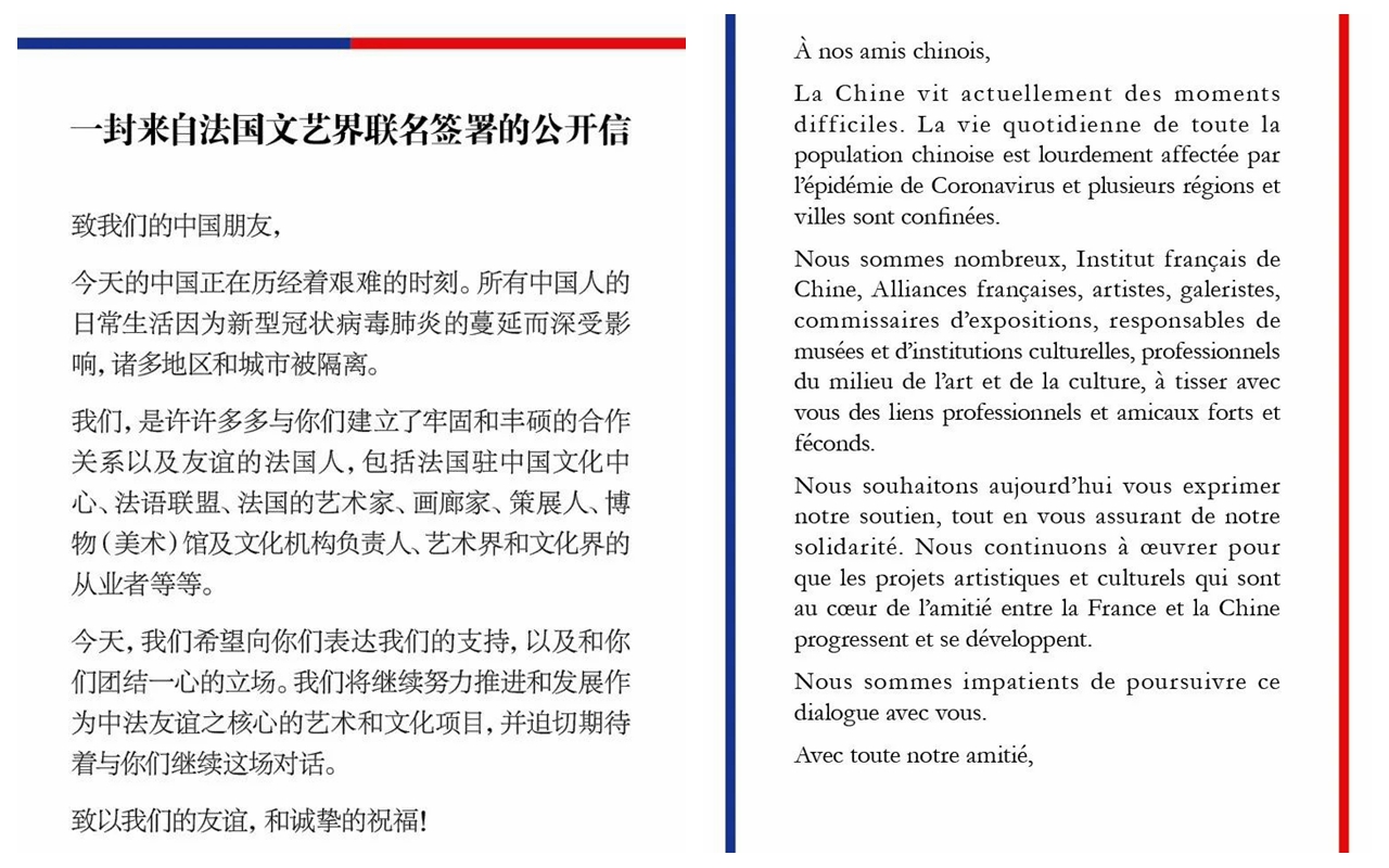 Several months earlier, more than 300 French artists and other cultural workers jointly issued a public letter in Chinese and French to express support for the Chinese, which was published by the industry magazine The Art Newspaper on February 22.