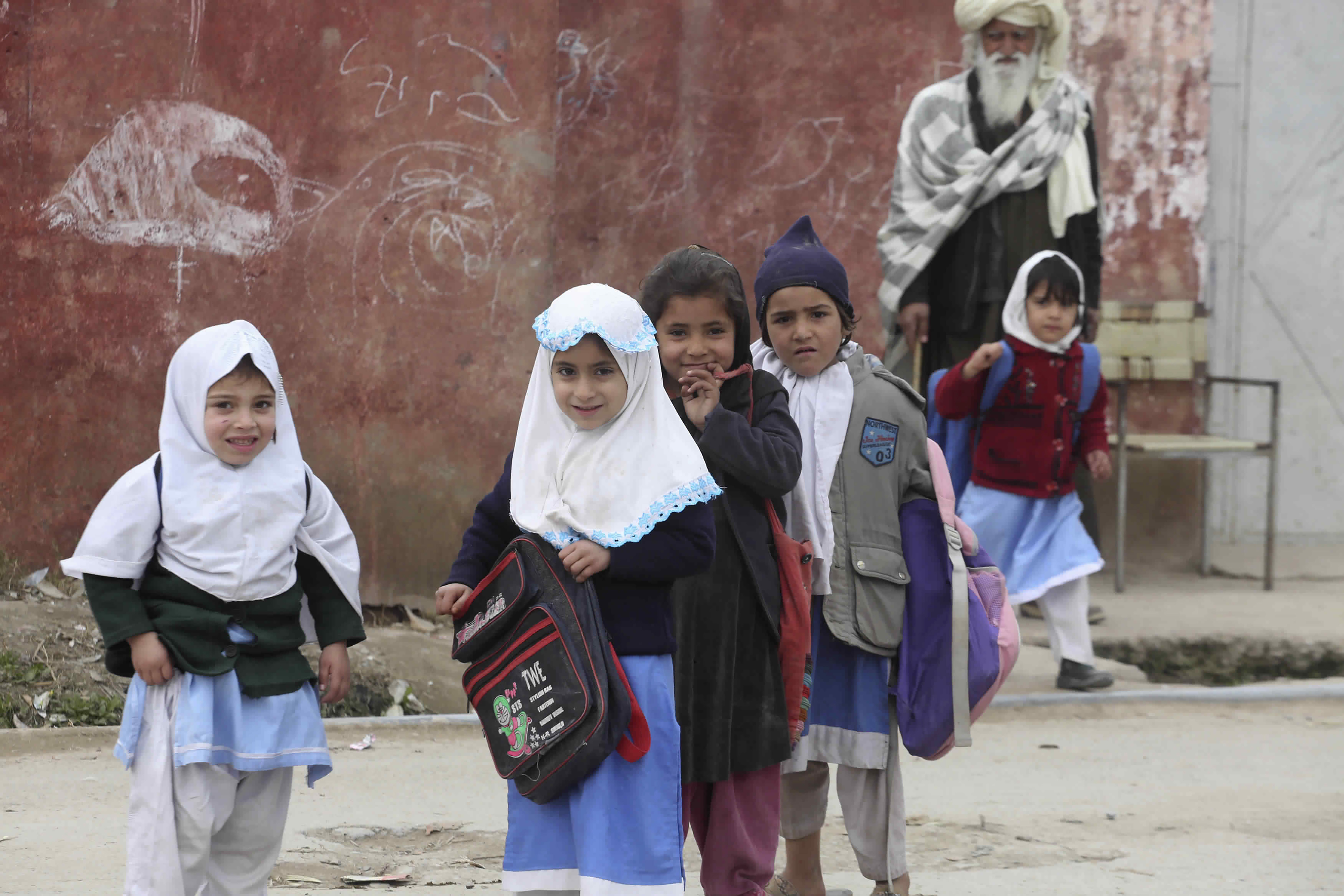 Afghan refugee schoolgirls leave their school in the Kabobayan refugee camp, Peshawar, Pakistan, February 13, 2020. /AP
