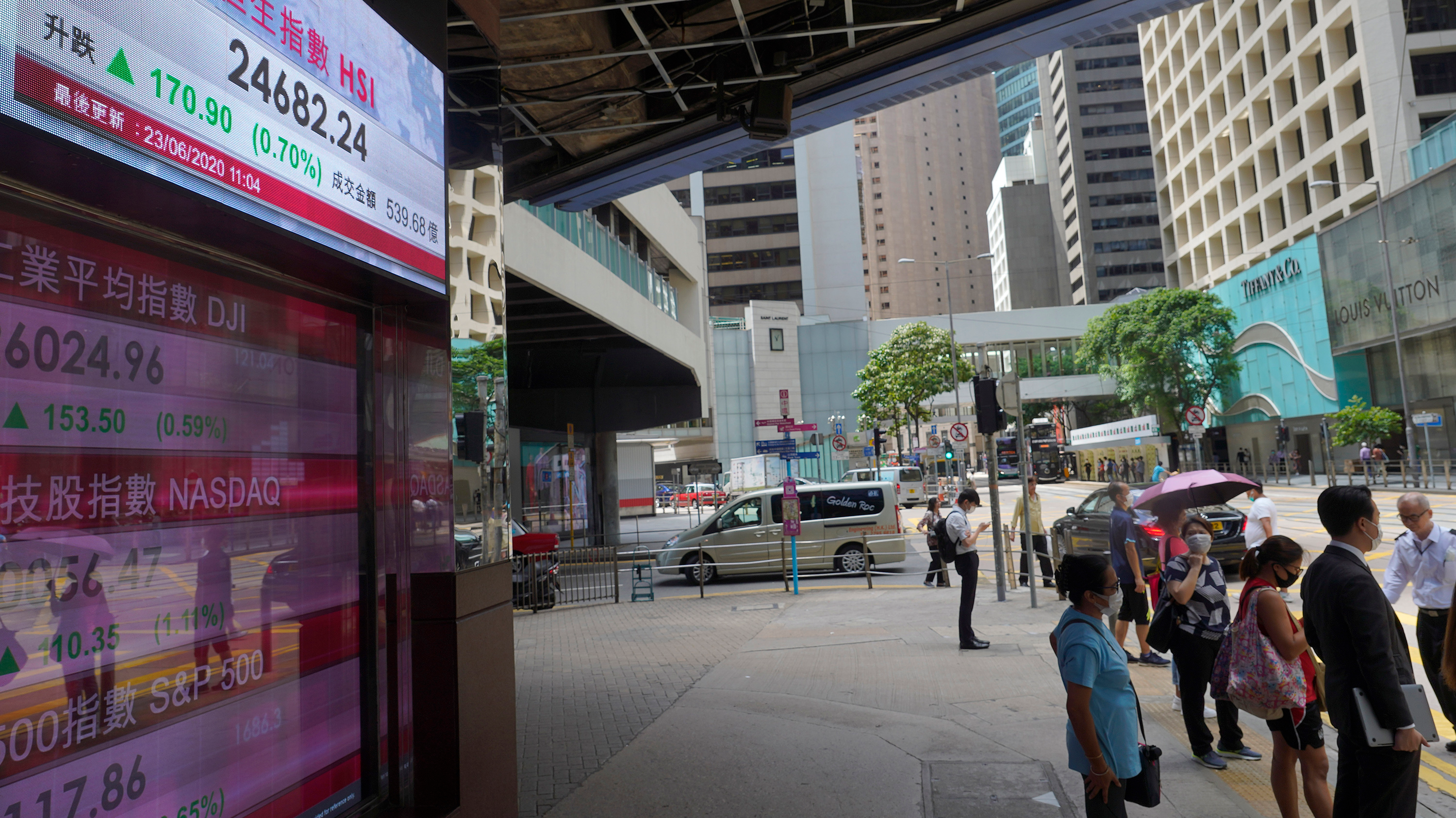 People wearing face masks walk past a bank's electronic board showing the Hong Kong share index at the Hong Kong Stock Exchange, June 23, 2020. /AP