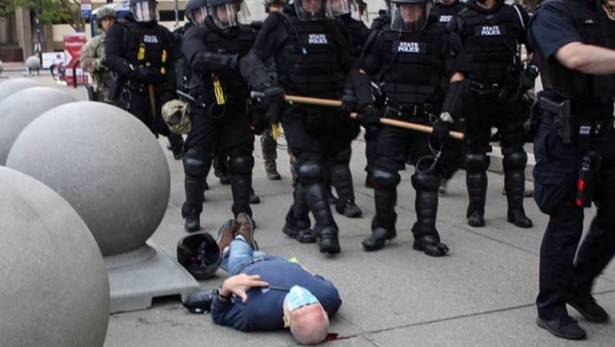 An elderly man lies on the ground after he was shoved by two police officers in Niagara Square in Buffalo, New York. /Reuters