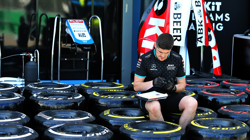 A Williams Racing mechanic sits on Pirelli tyres ahead of the later-canceled Australian Grand Prix at Albert Park in Melbourne, Australia, March 11, 2020. /VCG