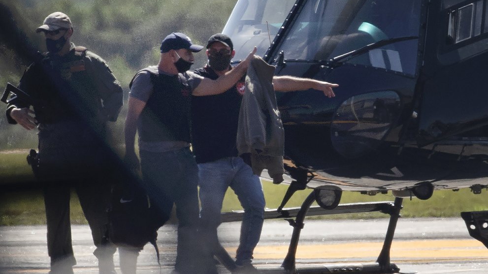 Fabricio Queiroz (second left) is escorted by police after arriving from Sao Paulo at the Japarecagua airport, Rio de Janeiro, Brazil, June 18, 2020. /AP
