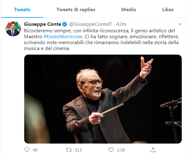 Shortly after Morricone's death was confirmed, Italian Prime Minister Giuseppe Conte tweeted: "We will always remember, with infinite gratitude, the artistic genius of the Maestro #EnnioMorricone. It made us dream, feel excited, reflect, writing memorable notes that will remain indelible in the history of music and cinema."