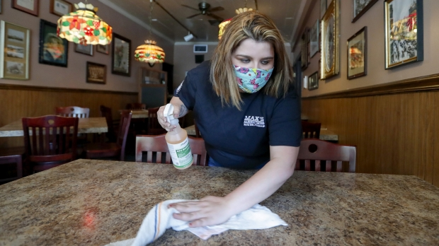 Sara Kennely cleans a dining table at Max's Allegheny Tavern, Pennsylvania, U.S., June 4, 2020. /AP
