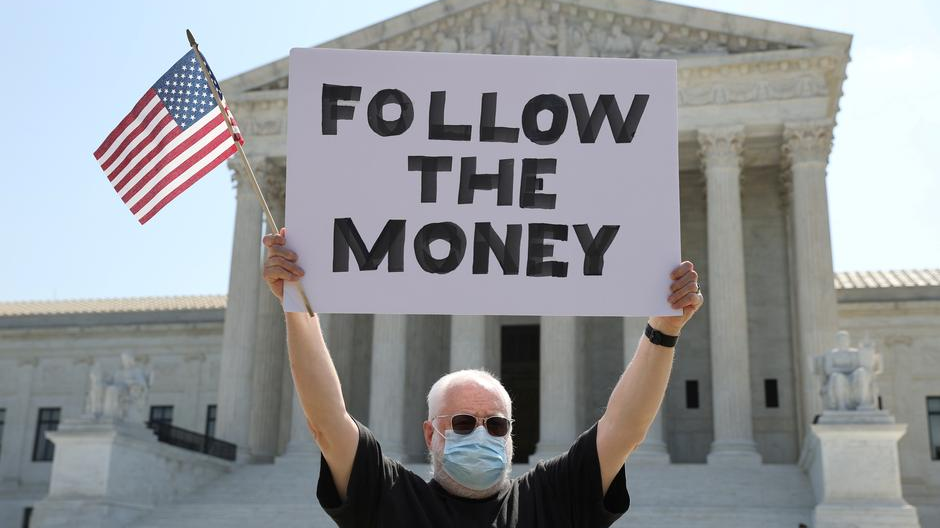 Bill Christeson holds a sign reading "follow the money" in anticipation of justices ruling on U.S. President Donald Trump's bid to block his financial records from being obtained by third parties, outside the U.S. Supreme Court in Washington, U.S., July 8, 2020. /Reuters