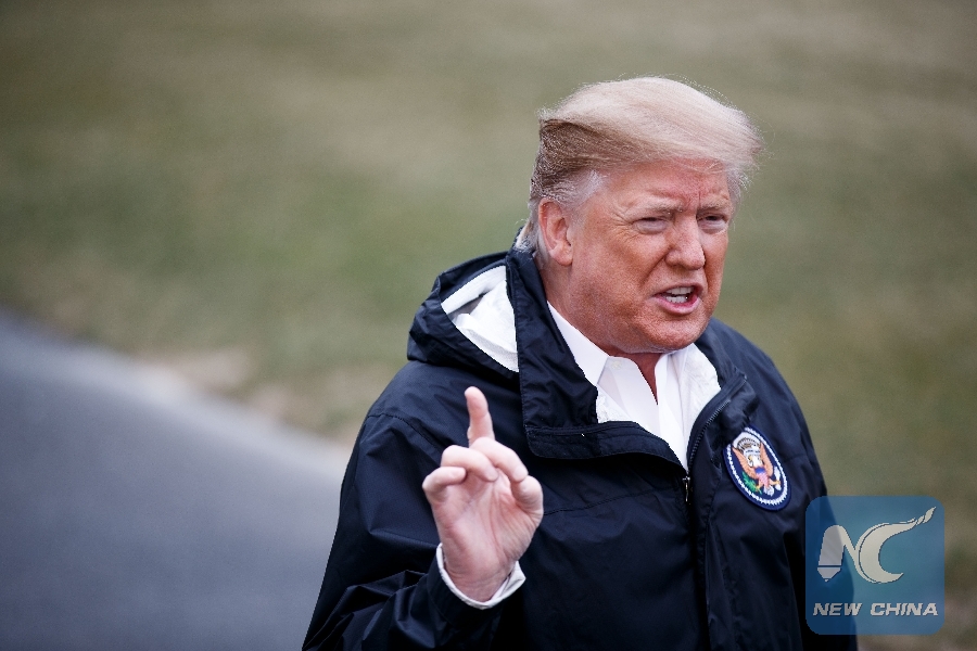 U.S. President Donald Trump speaks to reporters in Washington before leaving for Alabama to survey areas devastated by powerful tornadoes, March 8, 2019. /Xinhua