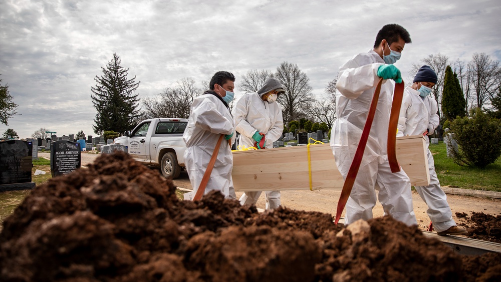 Gravediggers carry the casket of someone believed to have died from the coronavirus at Mount Richmond Cemetery in the Staten Island borough of New York, U.S., April 7, 2020. /AP