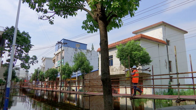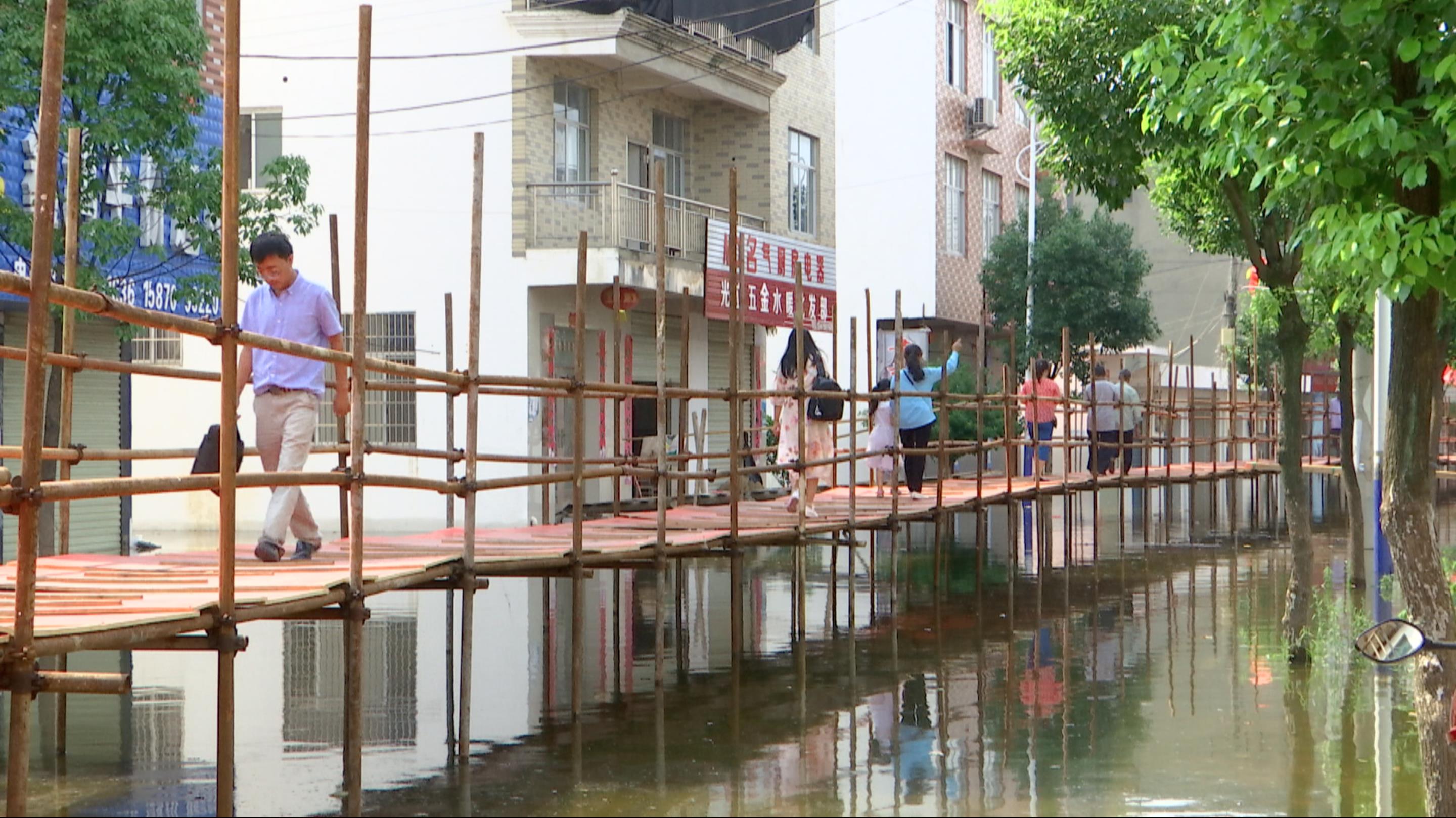 Residents walk on the temporary bridge built by local government amid the flooding in Maying town, Jiujiang City of eastern China's Jiangxi Province. /CGTN