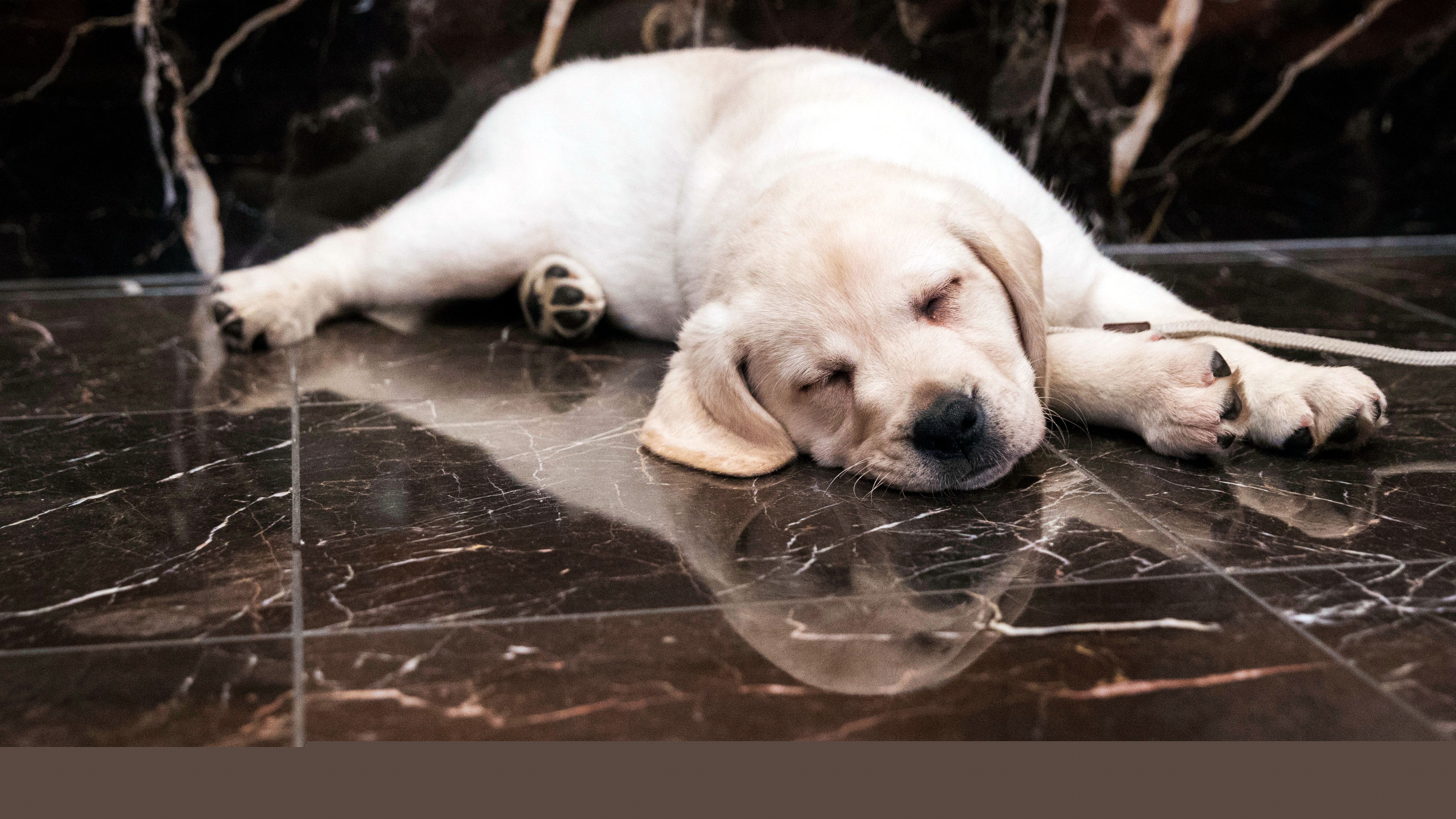 An eight-week-old Labrador retriever takes a nap during a news conference at the American Kennel Club headquarters in New York, March 28, 2018. /AP