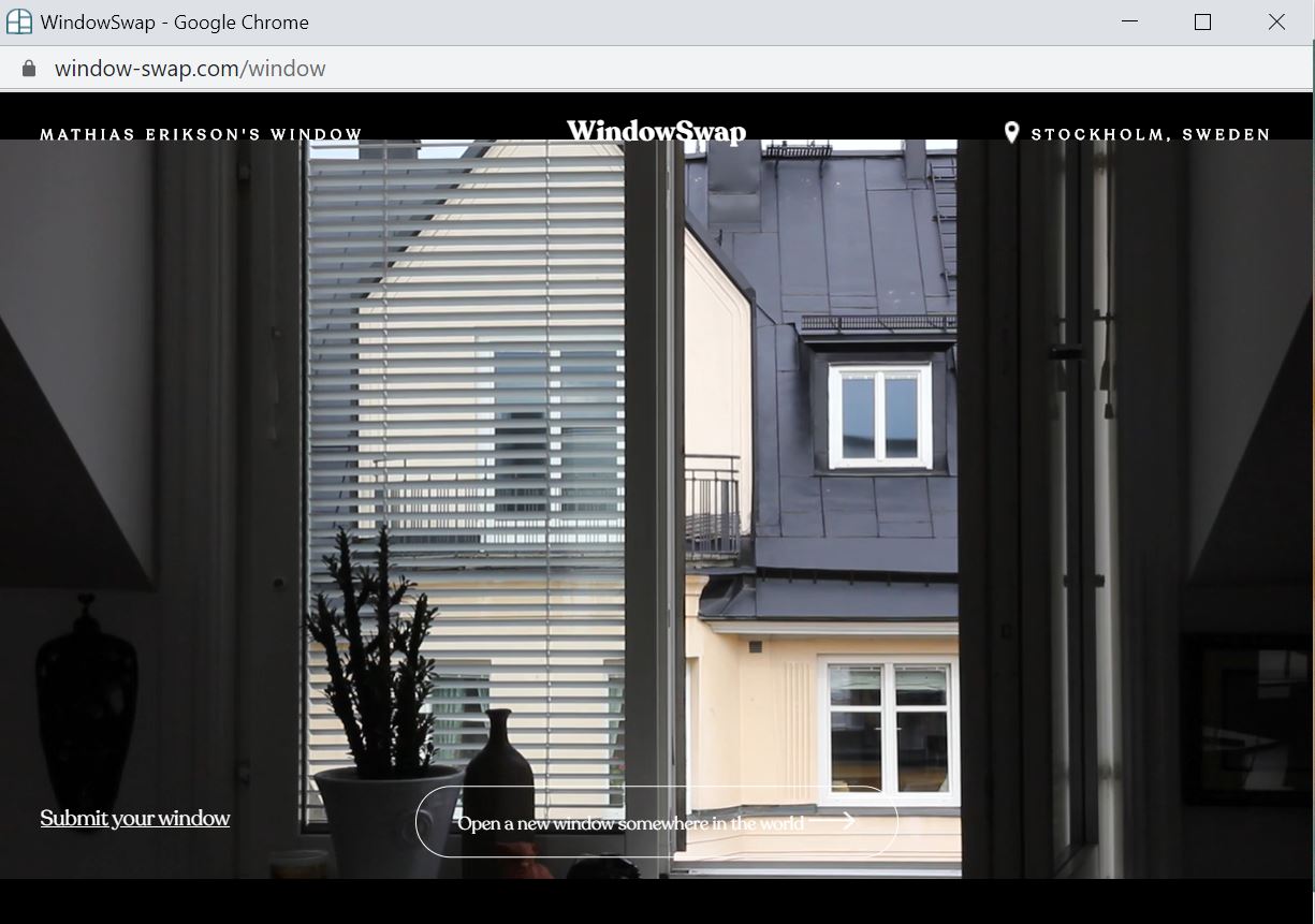The website "Window Swap" already features window views from Portugal, Canada, Argentina, Israel, China, Indonesia, France and Ukraine, among others, ranging from private backyards and street scenes to city skylines and hilly landscapes, complete with traffic noise, birds singing or ambient music.
