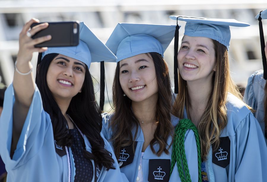 Graduate students take a selfie before the Columbia University Commencement ceremony in New York, the United States, May 22, 2019. /Xinhua