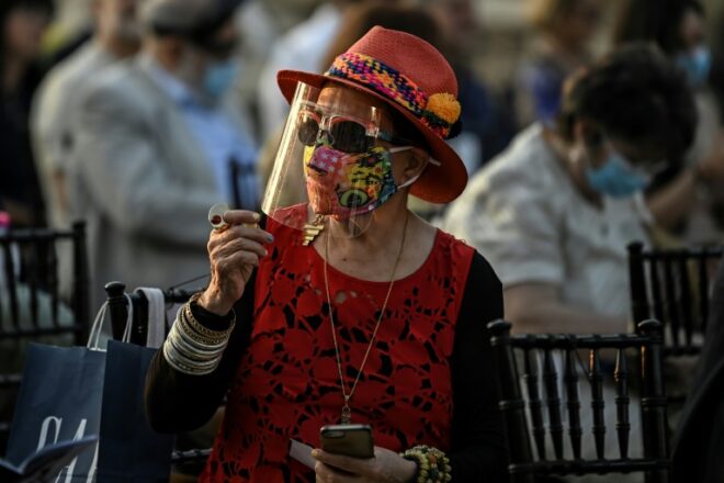 A spectator wearing a face mask and visor attends the concert. /AFP