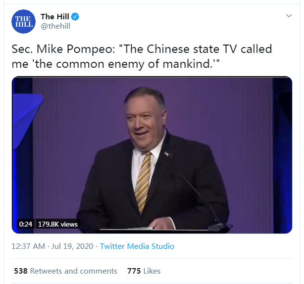 The video footage highlighted Pompeo defending being labeled "the common enemy of mankind" by China's state media. However, most Twitter commenters refused to buy his argument.