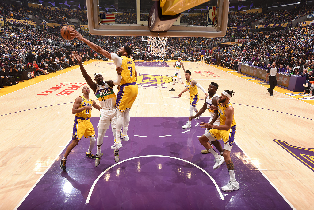 Anthony Davis #3 of the Los Angeles Lakers blocks a shot by Jrue Holiday of the New Orleans Pelicans at the Staples Center, February 25, 2020. /VCG