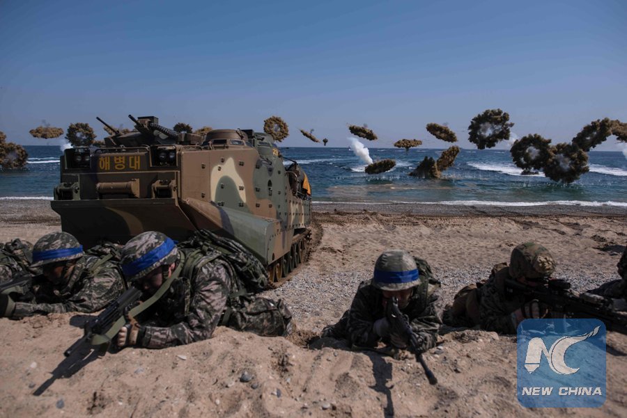South Korean and U.S. soldiers take a position during an annual joint military landing exercise in Pohang, on South Korea's southeast coast, March 12, 2016. /Xinhua