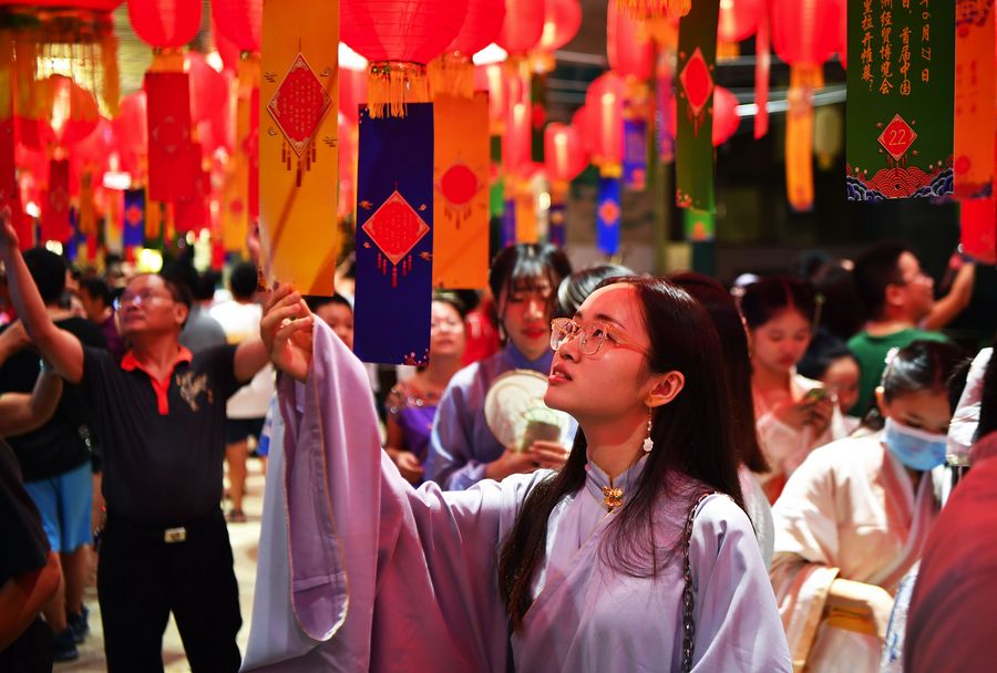 Visitors read riddles during an event held to celebrate the Mid-Autumn Festival in Hainan Museum, Haikou, south China's Hainan Province, September 13, 2019. /Xinhua
