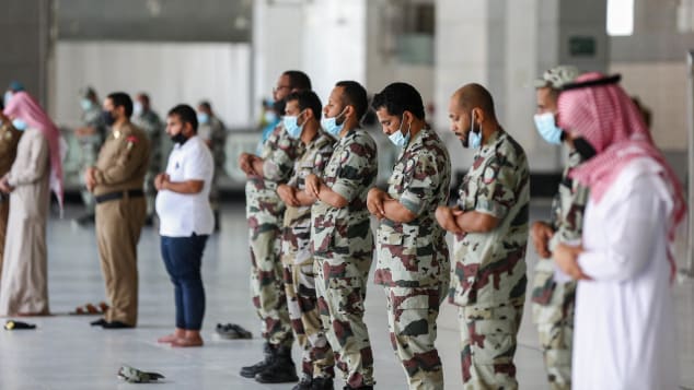 Workers and security at the Grand Mosque complex, mask-clad and socially distanced due to the COVID-19 pandemic, pray together. /AFP
