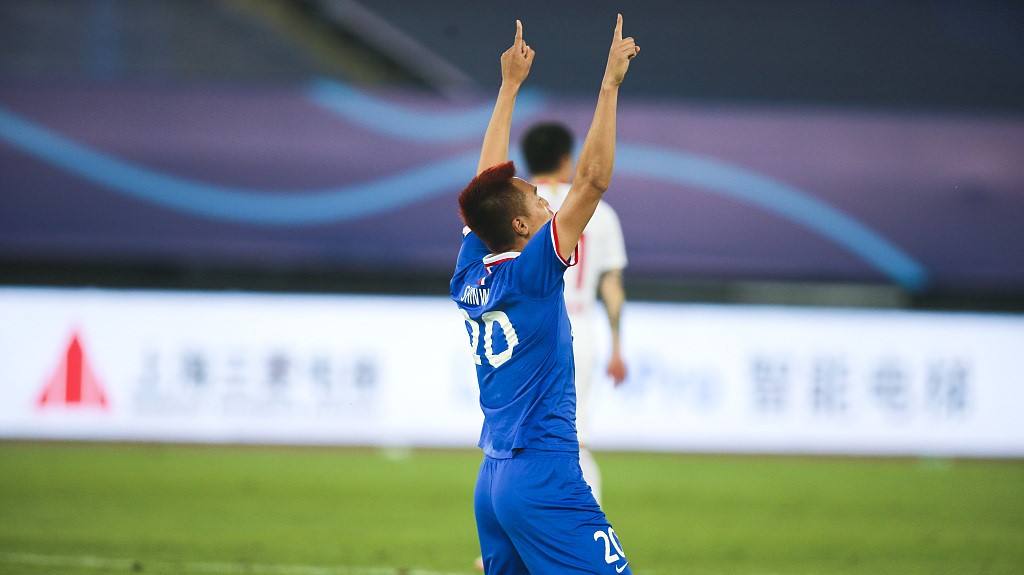 Kim Shin-wook of Shanghai Greenland Shenhua celebrates after scoring a CSL game goal against Shenzhen F.C. in Dalian, July 30, 2020. /VCG
