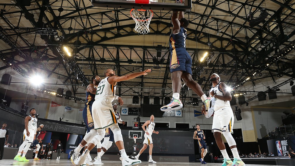 Zion Williamson #1 of the New Orleans Pelicans dunks in the game against the Utah Jazz at The HP Field House at ESPN Wide World Of Sports Complex, July 30, 2020. /VCG