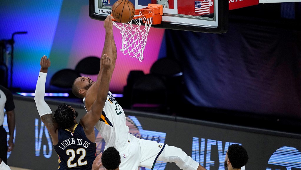 Derrick Favors #22 of the New Orleans Pelicans fouls on Rudy Gobert of the Utah Jazz in the game at The HP Field House at ESPN Wide World Of Sports Complex, July 30, 2020. /VCG