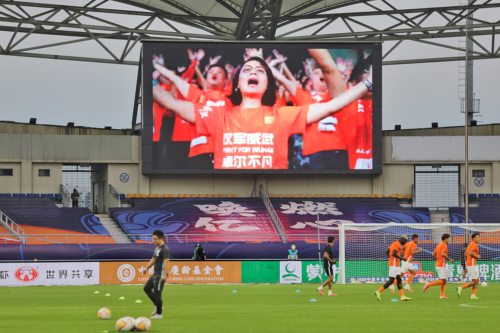 The big screen inside the stadium shows fans of the Wuhan Zall cheering for the team during the CSL team played behind closed doors in Suzhou, August 7, 2020. /VCG