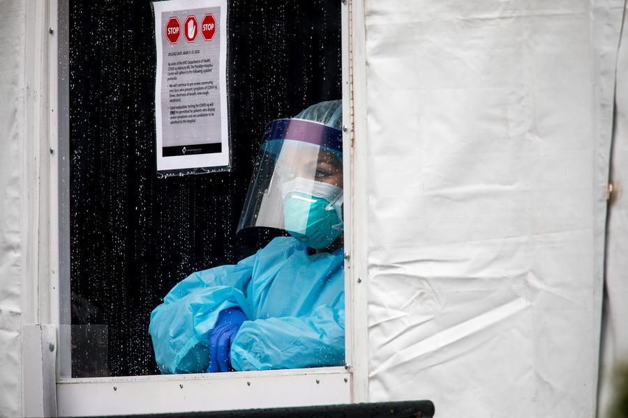 A healthcare worker looks out of the window of a tent in front of Brooklyn Hospital Center in New York, April 24, 2020. /Xinhua