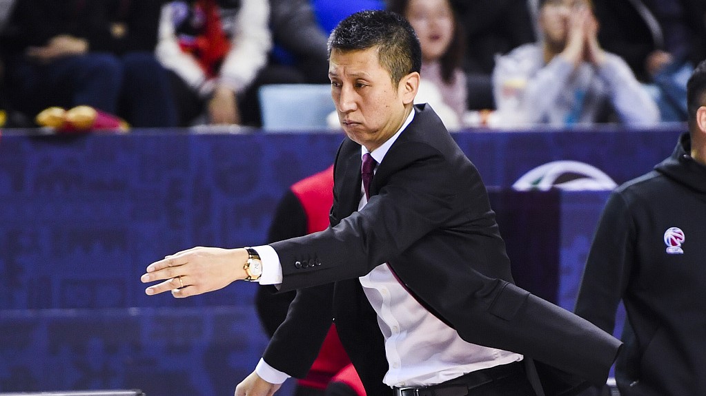 Guo Shiqiang, former head coach of the Liaoning Flying Leopards gives instructions in the game against the Nanjing Monkey Kings in Nanjing, capital city of east China's Jiangsu Province, January 16, 2020. /VCG