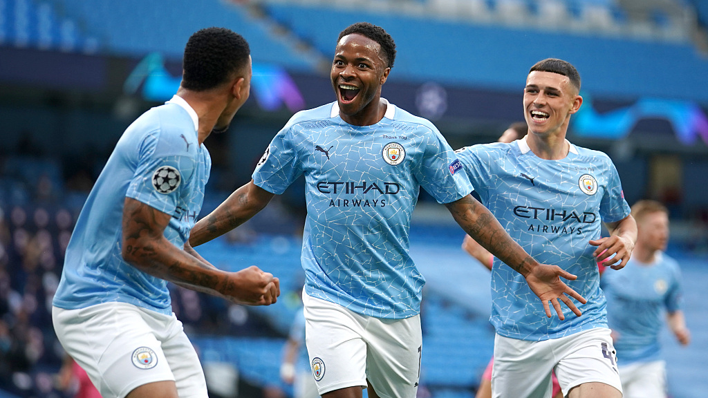 Raheem Sterling of Manchester City celebrates with teammates Gabriel Jesus and Phil Foden after scoring his team's first goal during the UEFA Champions League round of 16 second-leg match between Manchester City and Real Madrid at Etihad Stadium in Manchester, England, August 7, 2020. /VCG