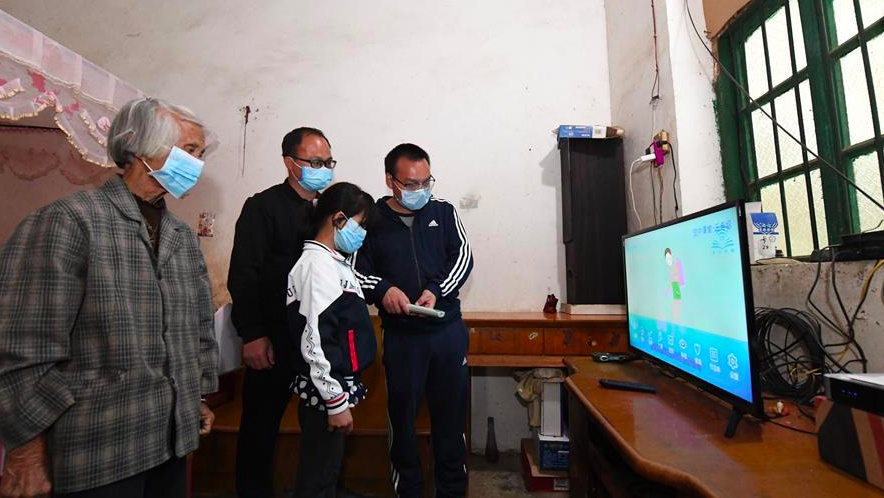 Teachers show a student how to access an online class system on a TV in Taiping Town, Nanning City, Guangxi Zhuang Autonomous Region, south China, March 12, 2020. /Xinhua