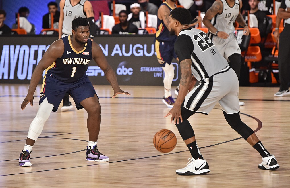 Zion Williamson #1 of the New Orleans Pelicans defends Rudy Gay of the San Antonio Spurs in the game at the HP Field House, August 9, 2020. /VCG