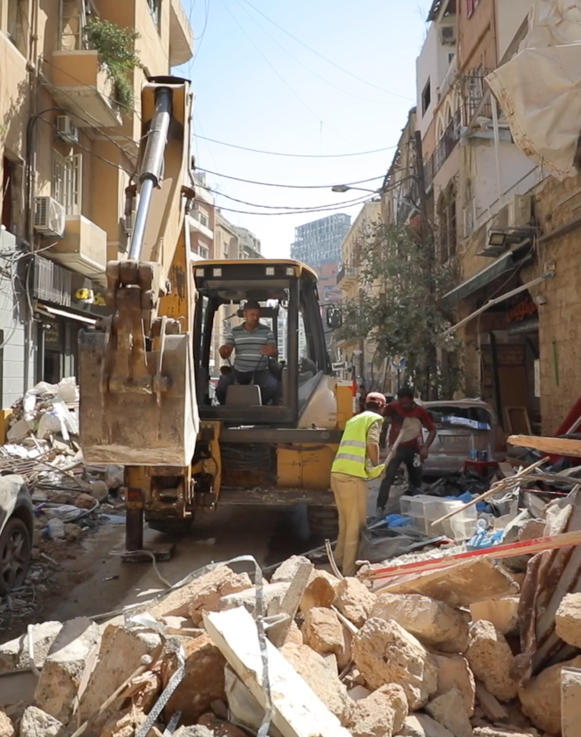 In one of Beirut's narrow streets, municipal workers are trying to clear the road of rubble of one of the collapsed buildings. Three blocks away from Beirut's port, the deadly August 4 explosion has not spared its adjacent districts from destruction.