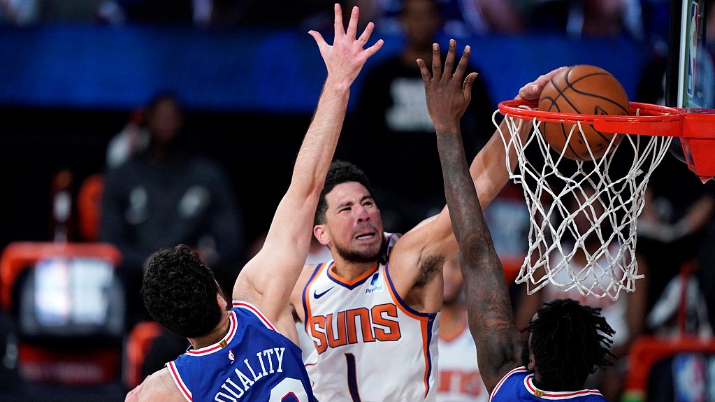 Deven Booker #1 of Phoenix Suns dunks in the game against Philadelphia 76ers at the Field House in Orlando, Florida, August 11, 2020. /VCG