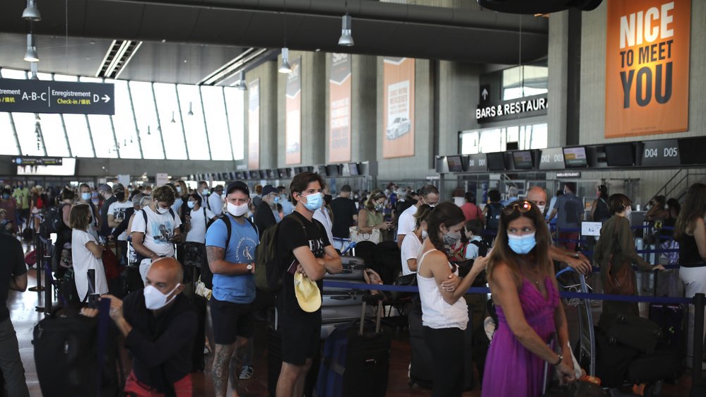 People queue in line to check-in for a British Airways flight to Heathrow airport at Nice airport, southern France, Aug.14, 2020. /AP