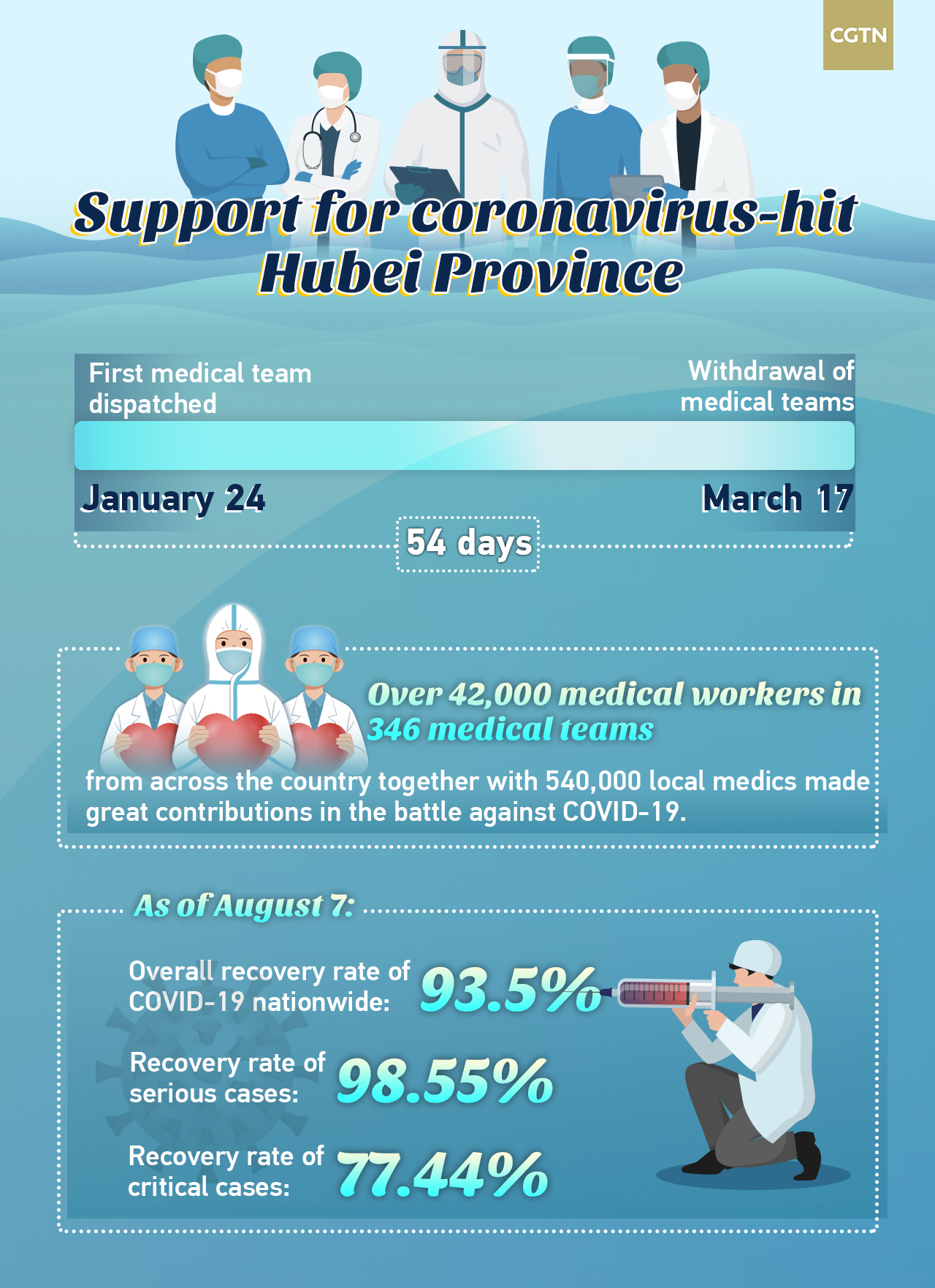 Starting from January 24, as the country started to celebrate the traditional Chinese New Year, more than 42,000 medical workers from 346 medical teams from different hospitals across China gathered in Hubei Province to battle COVID-19. Among them were top experts, military medics, experienced doctors and nurses of various disciplines from the country's best hospitals in different provinces.