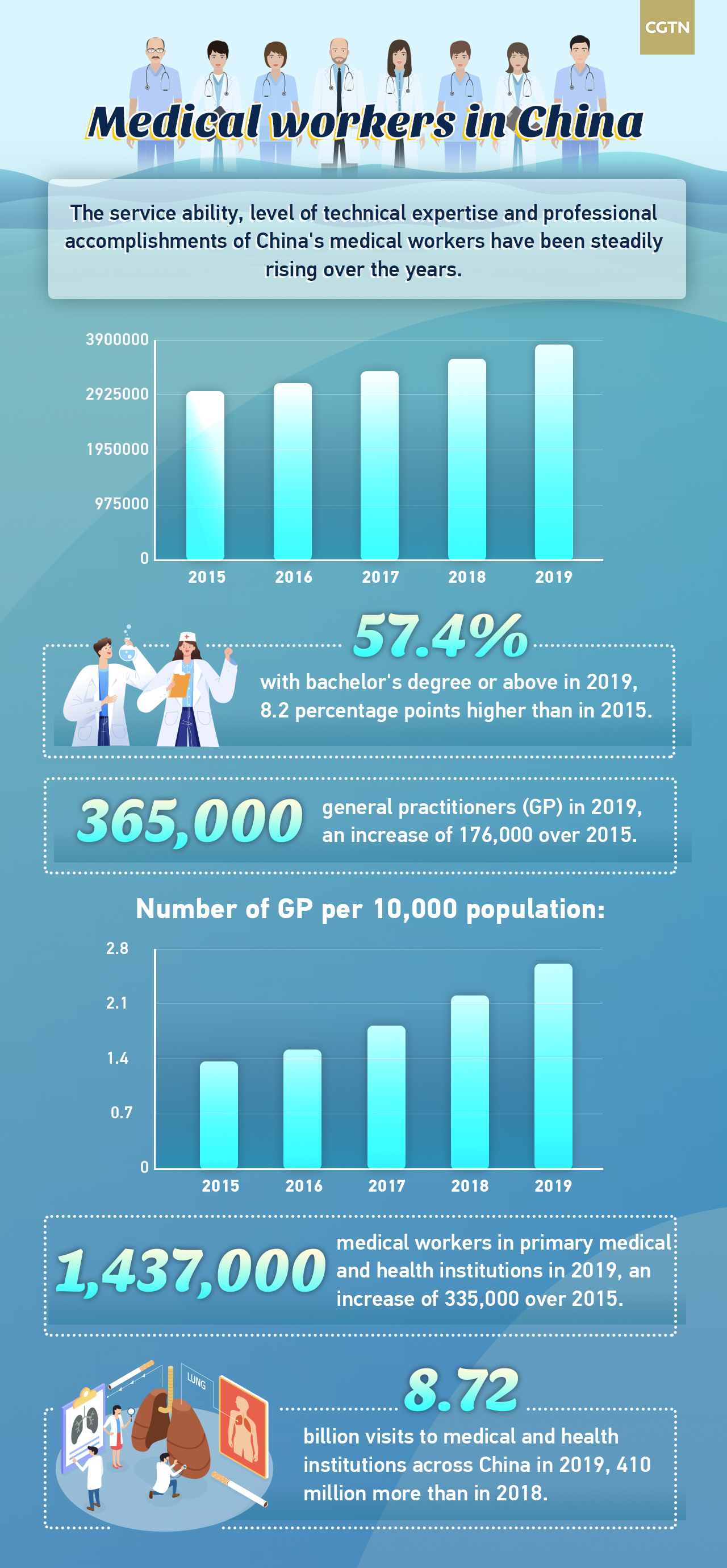 By the end of 2019, China has more than 3.8 million medical workers, among whom 57.4 percent have a bachelor's degree or above. Their service ability, level of technical expertise and professional accomplishments have steadily improved over the years.