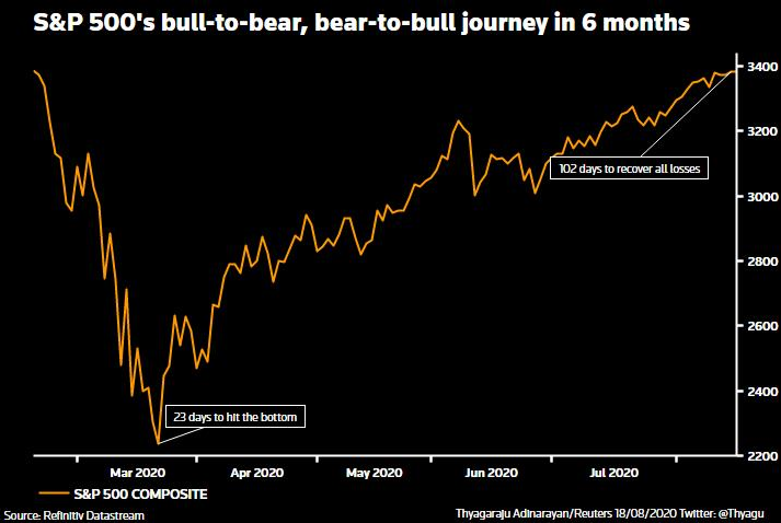 The S&P 500 closed at a record high on Tuesday, rebounding from huge losses triggered by the COVID-19 pandemic and crowning one of the most dramatic recoveries in the index's history.