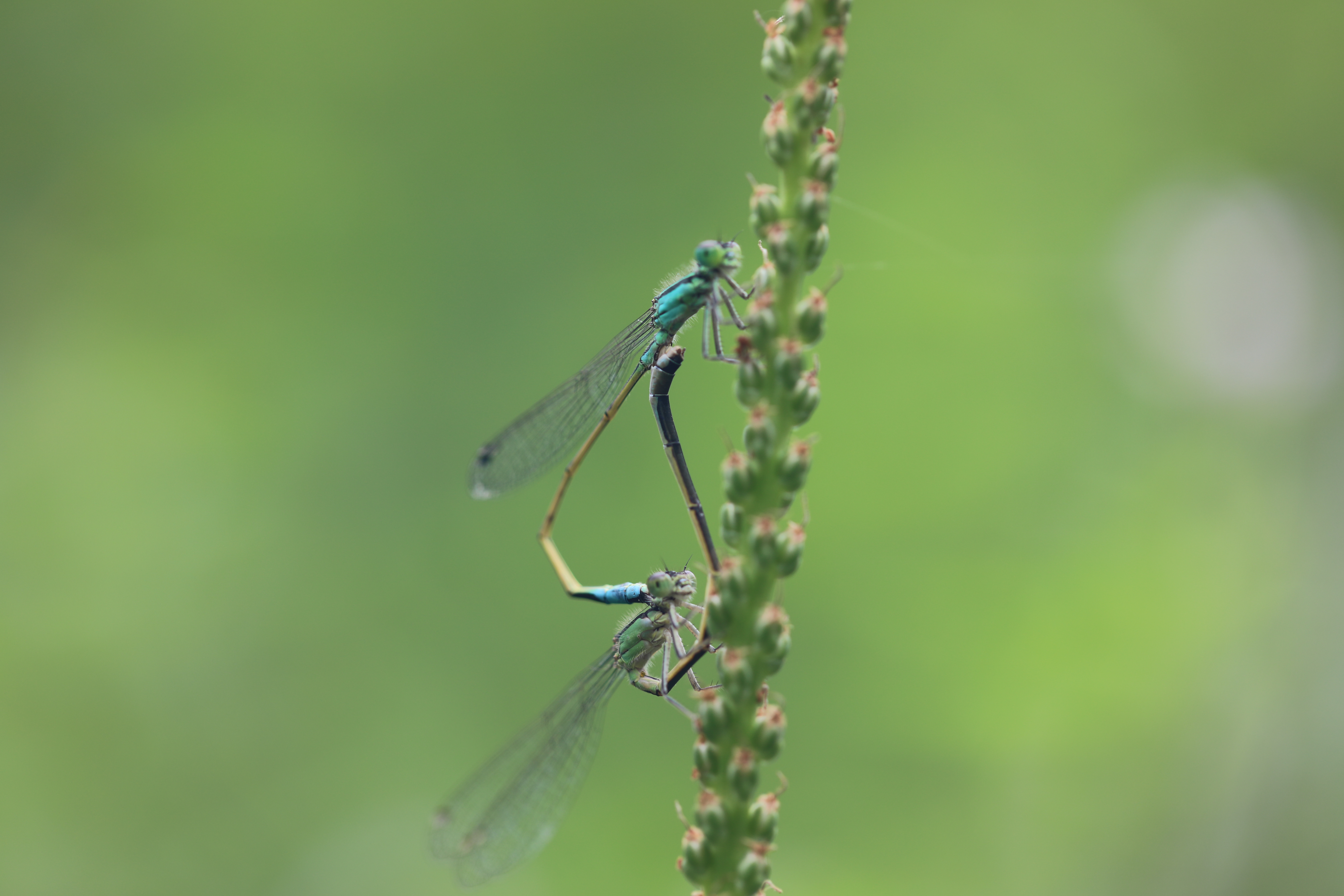 During mating, the male damselfly grasps the female's head while the female bends her abdomen to pick up the sperm at the front of the male's abdomen, forming a "heart" or a "wheel" shape.
