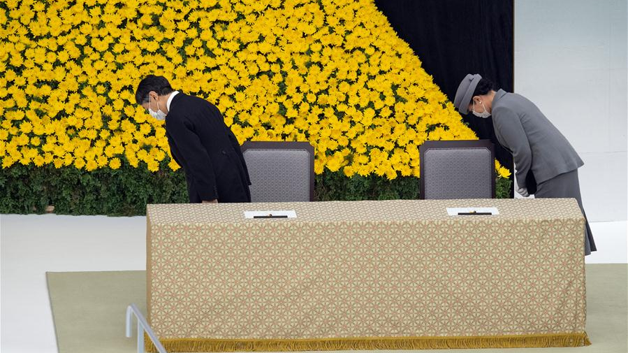 Japan's Emperor Naruhito (L) and Empress Masako attend a mourning ceremony marking the 75th anniversary of Japan's surrender in World War II at Nippon Budokan in Tokyo, Japan, August 15, 2020. /Xinhua